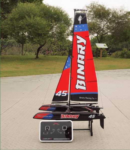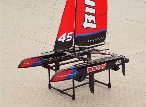 De eleganta dubbelskroven skär genom vattnet med lätthet och stabilitet och svängegenskaper förstärks av fenan på varje skrov plus de djupa tvillingrodren. Skroven och anslutningsramen är alla gjutna av slitstark plast och masterna är gjorda av utpressad GRP som ger den styvhet som behövs i en katamaran. Radion är Joysways vanliga 2-kanals 2.4Ghz-design, som genom åren har bevisats vara enkel att använda och pålitlig. Binary levereras som standard med ett stativ att vila båten på som enkelt kan tas isär vid behov.