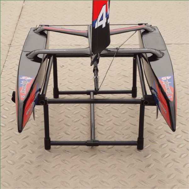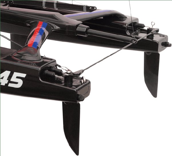 The sleek twin hulls cut though the water with ease and stability and turning are enhanced by the fin on each hull plus the deep twin rudders. The hulls and connecting frame are all moulded from durable plastic and the masts are made from extruded GRP giving the rigidity needed in a catamaran. The radio is Joysway’s regular 2 channel 2.4Ghz design, proven over the years to be easy to use and reliable. The Binary comes as standard with a stand to rest her on which can be easily disassembled if required.