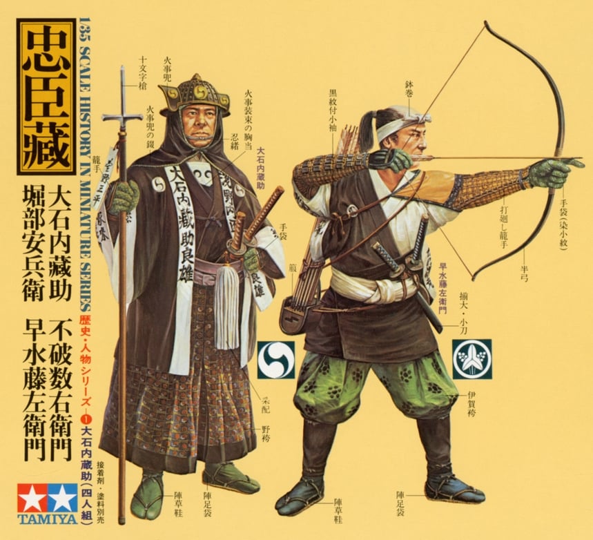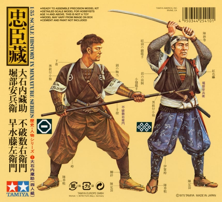 These are 1/35 scale Samurai Warrior figures. They are a slight departure from Tamiya’s usual military subjects as they depict Japanese samurai warriors from the tale of the “47 Ronin”, a legend of revenge made famous in the West by the eponymous Hollywood movie. The kit comes with a wealth of information about clothing and customs in English. The included instruction manual is also an interesting source of reference for aficionados of Japanese history and culture.