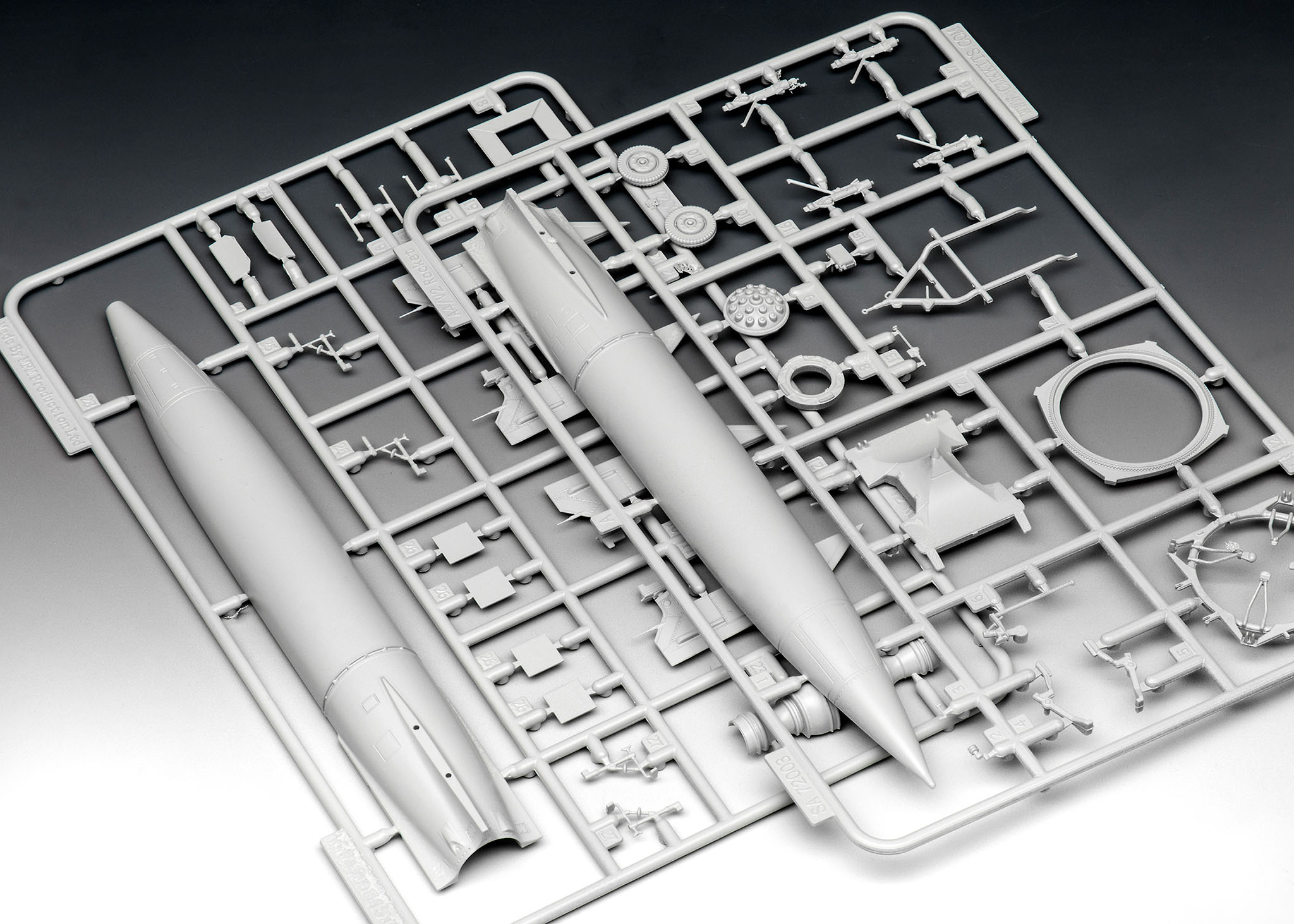 Model kit of the German large rocket A4/V2, which was the first flying object to cross the border into space with its liquid engine.