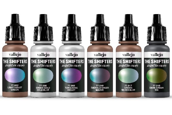 The sets in The Shifters range contain a selection of water-based acrylic airbrush metallic colors. Depending on the light or angle, color shifts from one shade to another. Shake well, apply in thin layers. Best effects obtained over a gloss black base color.